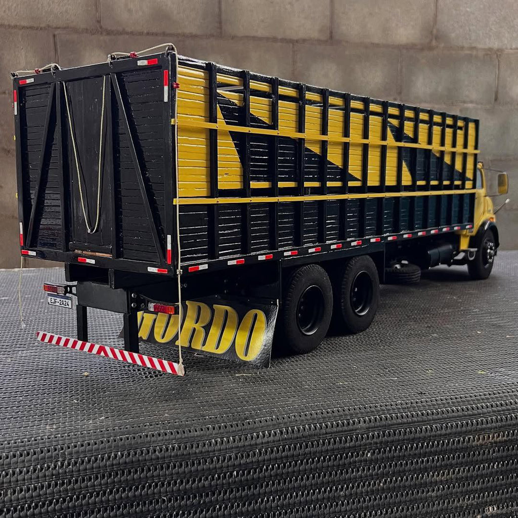 Modelo em metal diecast (com partes em ABS), acabamento premium e fidelidade nos mínimos detalhes — cabine 1113 clássica, eixo duplo traseiro (6x2), lanternas, retrovisores, parachoque e carroceria boiadeira alta com ripas e travessas realistas.
